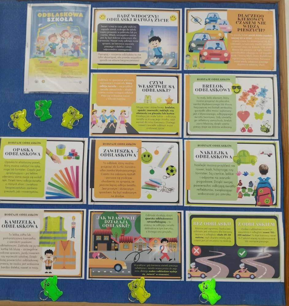 w pobliżu sal lekcyjnych. Na gazetce umieszczono m.in.: informacje o obowiązku noszenia odblasków po zmroku oraz przykłady dobrze widocznych elementów odblaskowych.