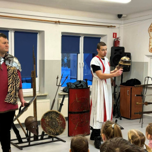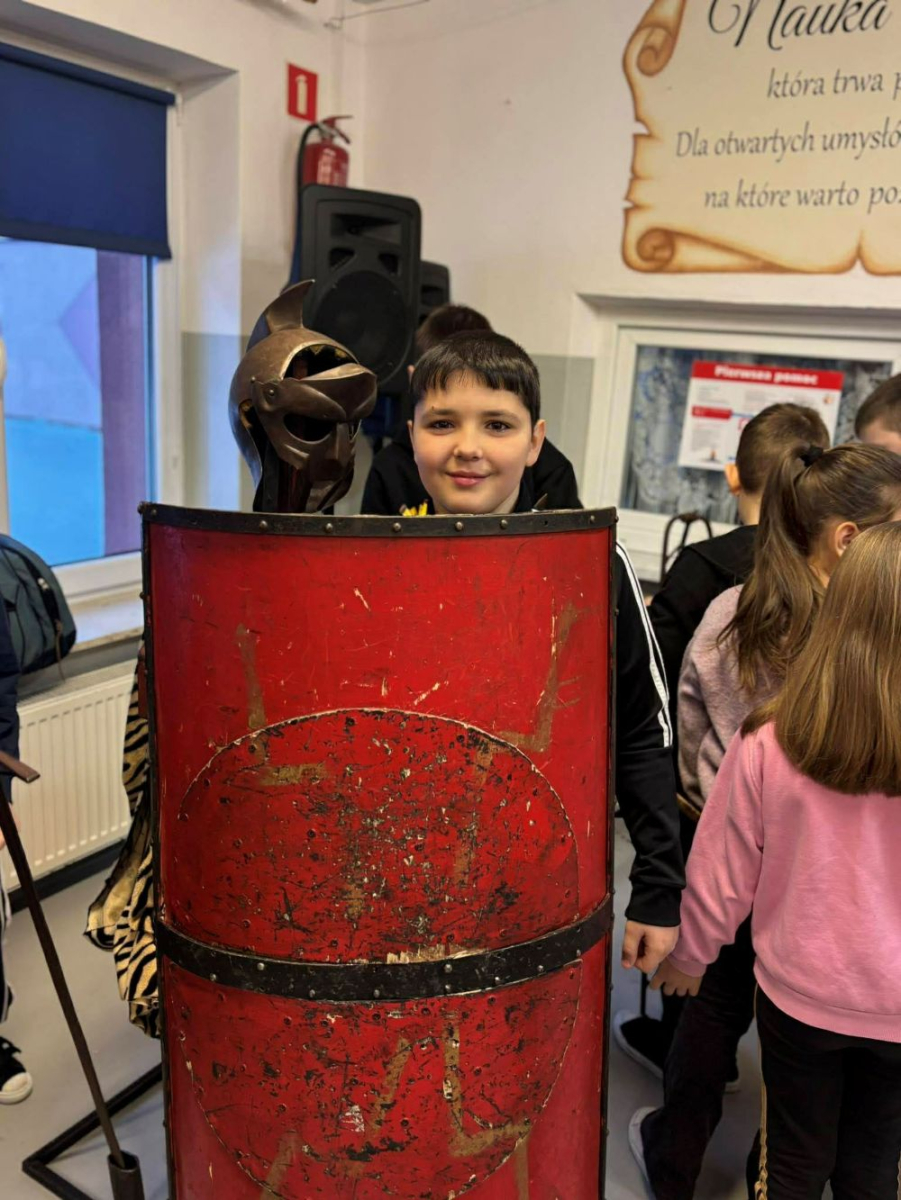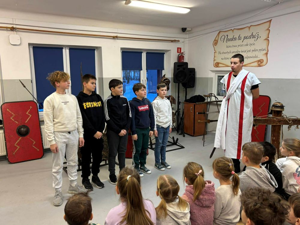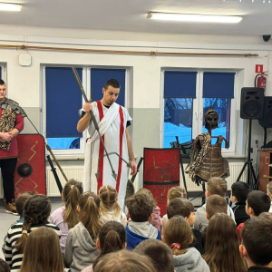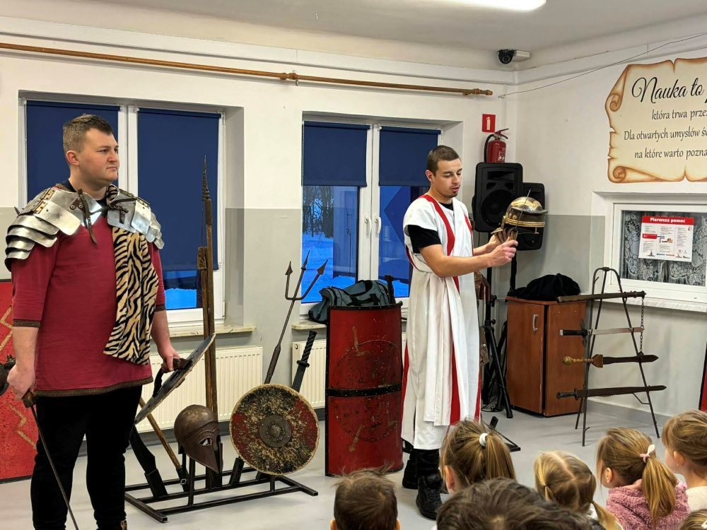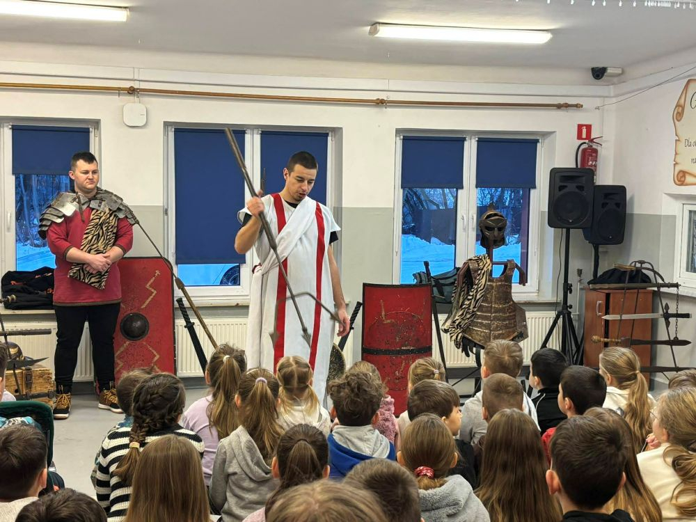Podczas żywej lekcji historii przenieśliśmy się w czasy Imperium Rzymskiego. Uczniowie zostali zapoznani w bardzo ciekawy sposób o zwyczajach i tradycjach starożytnego Rzymu, surowym prawie i narzędziach tortur. Podczas występu zobaczyliśmy odtworzone stroje rzymskich legionistów, senatorów i gladiatorów.