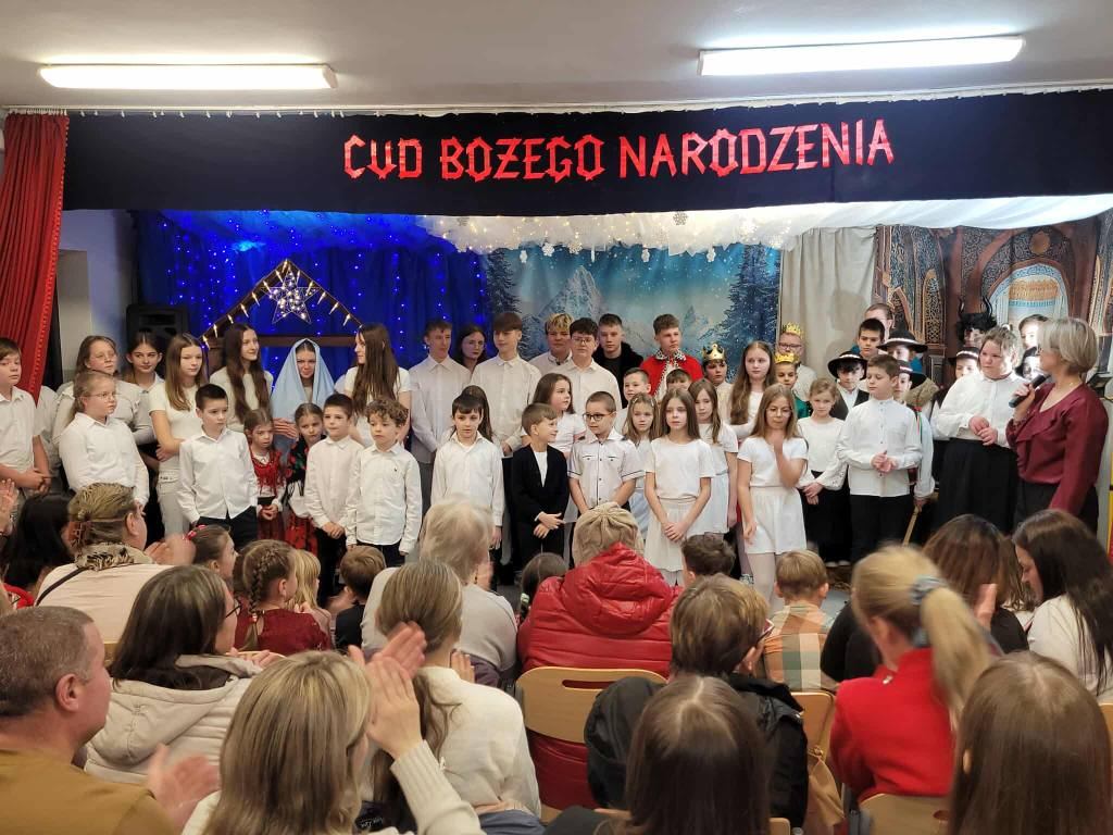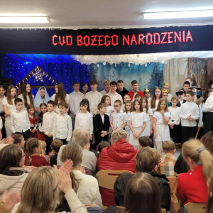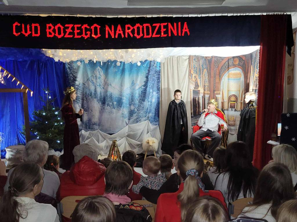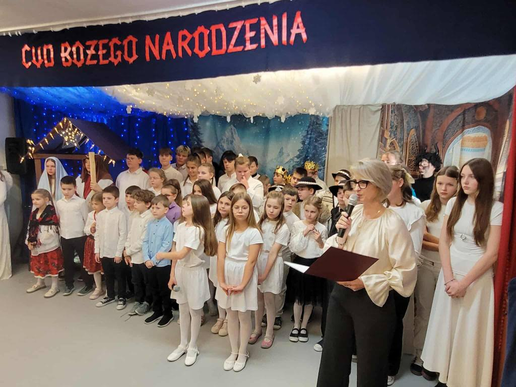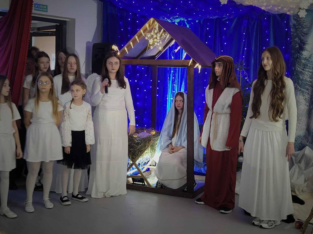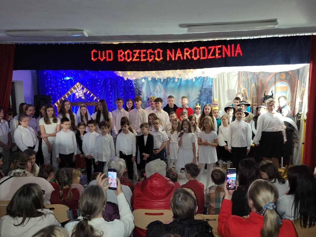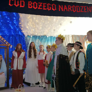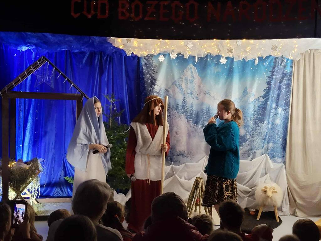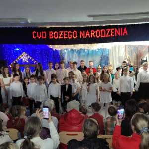 „ Cud Bożego Narodzenia” pod takim hasłem 11 grudnia 2025 roku odbyły się w naszej szkole Jasełka Bożonarodzeniowe. Do szkoły licznie przybyli zaproszeni goście oraz rodzice uczniów. Uczniowie w specjalnie przygotowanych na tę okazję strojach oraz w pięknej scenografii przedstawili sceny narodzin Chrystusa. Był święty Józef, Maryja, królowie, pasterze, Herod, Herodowa, diabeł oraz śmierć . Zgromadzona publiczność po raz kolejny mogła przeżyć historię narodzin Jezusa Chrystusa, którą nasi uczniowie zaprezentowali z wielkim zaangażowaniem i wrażliwością. Przesłanie Jasełek było bardzo wymowne: w dzisiejszych czasach, tak samo jak ponad 2000 lat temu, Jezus puka do drzwi i szukał schronienia w niejednym sercu człowieka, tylko od nas zależy, czy to zauważymy i przyjmiemy Go do siebie. Jasełka wprowadziły wszystkich w świąteczny nastrój,