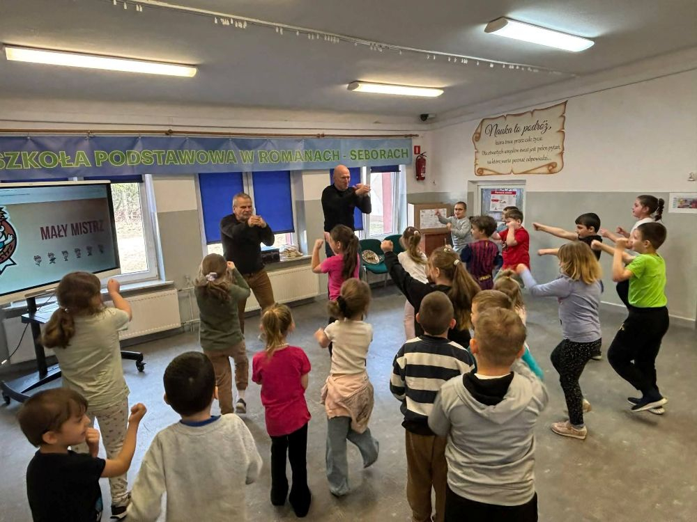 Najbardziej wyczekiwanym momentem był jednak wspólny trening. Pod okiem mistrza i jego asystenta uczniowie mogli poczuć się jak prawdziwi sportowcy. Było dużo ruchu, śmiechu, ale też skupienia i zaangażowania. Każdy ruch, każdy krok był nie tylko ćwiczeniem fizycznym, ale też lekcją odwagi, dyscypliny i wiary w siebie.