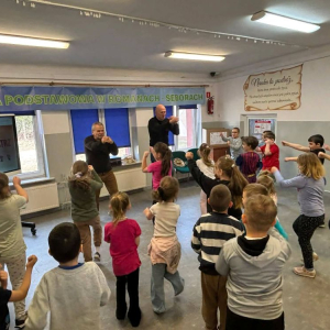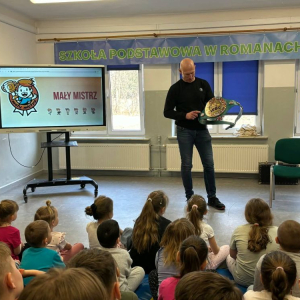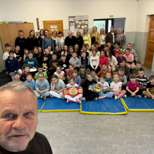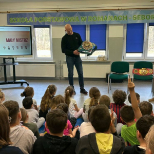 Pan Krzysztof Włodarczyk opowiadał o swojej drodze – nie zawsze łatwej, często wymagającej ogromnego wysiłku i determinacji. Mówił o chwilach zwątpienia, ale też o sile, która pozwala się podnieść i iść dalej. Jego słowa były szczere, pełne emocji i prawdy. Dzieci słuchały z zapartym tchem, a potem odważnie zadawały pytania. Pytały o treningi, o walki, o to, czy się bał. Mistrz odpowiadał cierpliwie i z uśmiechem, a Pan Jan Dobrzyjałowski uzupełniał jego wypowiedzi, dodając cenne ciekawostki i wskazówki.