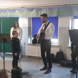 Artyści w składzie: pani Justyna, pan Tomasz, pan Piotr podczas koncertu zaprezentowali nam gitarę.