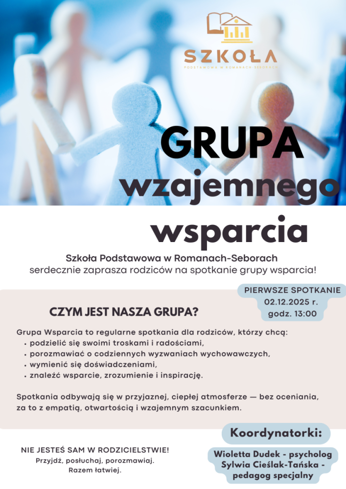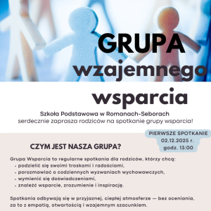 W naszej szkole powstała "Grupa wzajemnego wsparcia" dla rodziców. Na spotkania zapraszamy każdego rodzica (również nie z naszej szkoły). Pierwsze spotkanie odbędzie się 02.12.2025r. o godzinie 13:00 w sali nr 2. Jeżeli będziecie Państwo chcieli podczas spotkania możecie podzielić się swoimi radościami, sukcesami, porażkami smutkami, poradami, doświadczeniami... dotyczącymi rodzicielstwa.